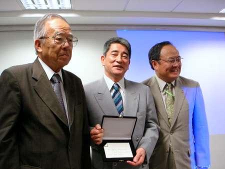 また日本企業の特許申請は年間3万6,000件で、米国の8万件には及ばないが、中国企業の申請件数は僅か、世界中で高齢化社会がやってくるが、女性でも一人で介護できるシステムやロボットの開発、また高齢化社会を先取りしたトヨタの一人乗りカー開発、無人運行電車のゆりかもめ、新幹線技術、特に地下の利用で洪水対策、ナノテク、ハイブリッド、水素の研究など素晴しい技術を擁しており、中小企業では手作り、匠の技などで世界シェアを握っている企業も顕在であり、水族館のアクリルパネル生産では、NIPPURA社が世界シェアの過半数を握っており、日本の技術力の高さを強調して講演を終え、質疑応答では靖国神社参拝、戦争責任、衆議院選の行方、オリンピック後の中国経済の行方、ブラジル在住日本人への老齢福祉年金などについて質問が交わされ、田中信会頭より記念のプレート贈呈が盛大な拍手でもって行なわれた。