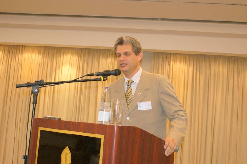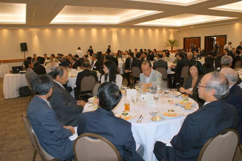 特別スピーチではマリンガ市の「パルケ・ド・ジャパン」ではDVDで紹介,今まで数多くの日本進出企業の支援に対する感謝の意を述べ、また完成を目指して最終工事を行なっているが、更なる日系企業の協力を依頼、オウリーニョス市のトシオ・ミサト市長はPPTでオウリーニョス市のインフラ環境や教育環境、市の概要を紹介、日系企業の投資・誘致についての積極的にメリットを紹介、ダイキン工業の岡田茂男顧問は「経営者は知恵を出せ」と題して、日本人は世界金融危機で首を垂れて歩いて元気がないのは経営者側にも大きな責任があり,カエルを例にたとえるとぬるま湯につけて徐々に温度を上げていくと死んでしまう、100年に1度の危機は裏を返せば大きなチャンス到来と受取ることが出来るので、経営者はチャンス到来と考えて果敢に事業を展開すべきであると述べた。