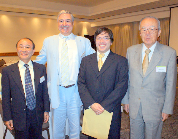 左から平田藤義事務局長/バンデイランテス・コムニケーショングループのジョアン・カルロス・サアジ社長/イマージェン・ド・ジャパンTV・エ・ジョルナリズモ社のマリオ・ジュン・オクハラ氏/田中信会頭