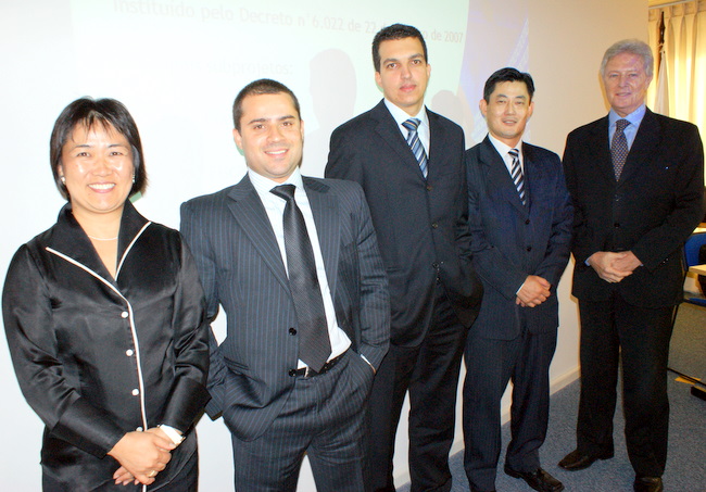 左から4人目は進行役のクラウジオ・ヤノ副委員長並びに講演者(fotos Rubens Ito/ccibj)