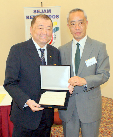 左から記念品を受取るジョージ・ヤナイ上院議員/松田雅信副会頭