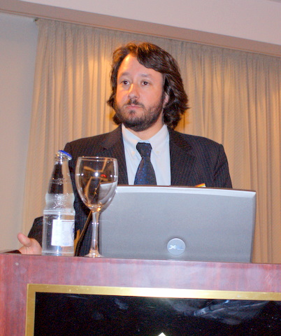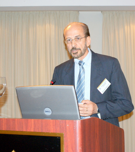 環境コンサルタントのマルセロ・ロッシャ氏の講演に先立って中山会頭が歓迎の辞、岡村昌一コンサルタント副委員長が講師を紹介、マルセロ氏は「カーボンクレジットの将来」と題して、京都議定書の歴史、意義、目的、ブラジルは途上国として第一次計画のCO2削減義務目標達成を免除されているが、ブラジル国内の排出削減に対する長期目標や取り組みなどについて説明した。