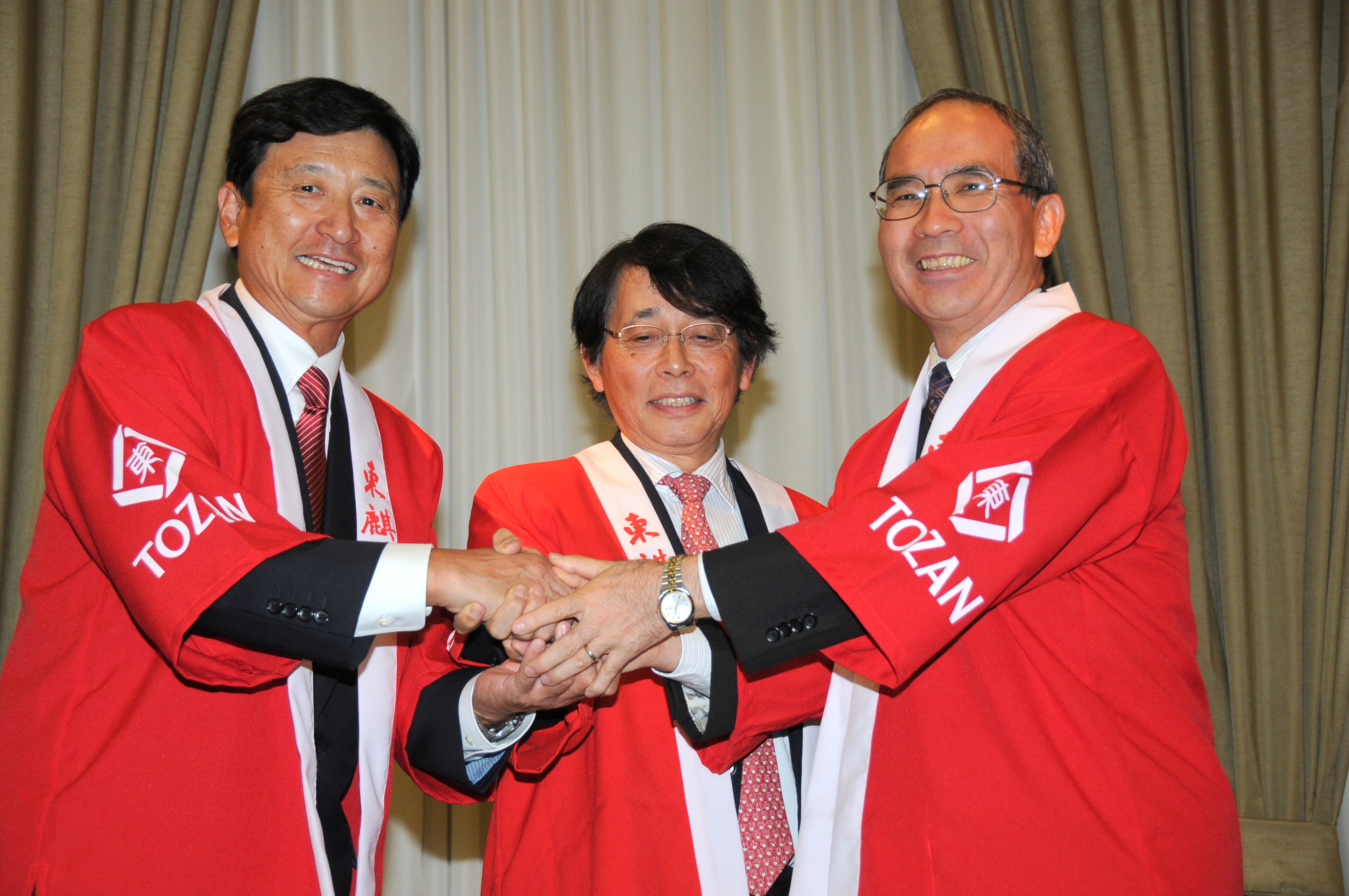 左から鏡開きの後で固い握手を交わす中山立夫会頭/三輪昭在ブラジル日本国特命全権大使、ブラジル日本商工会議所名誉顧問の大部一秋在サンパウロ日本国総領事(写真は望月二郎さん提供)