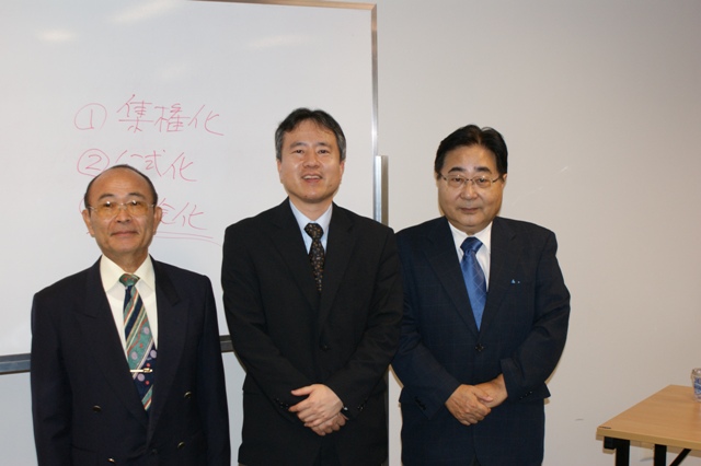 左から平田藤義事務局長/講演者の大阪商業大学総合経営学部の古沢昌之教授/コンサルタント部会の都築慎一部会長