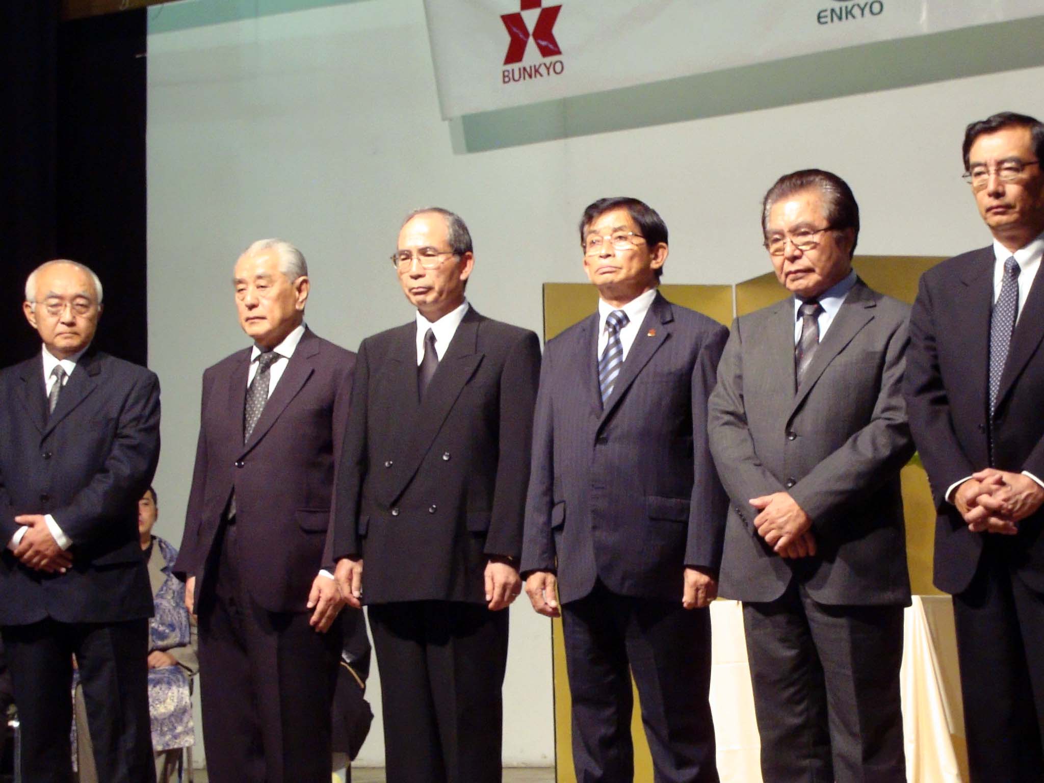 左から3人目は大部一秋総領事/日系5団体代表/右端は中山立夫会頭代理の前田一郎日系社会委員長(写真提供 ブラジル日本文化福祉協会)