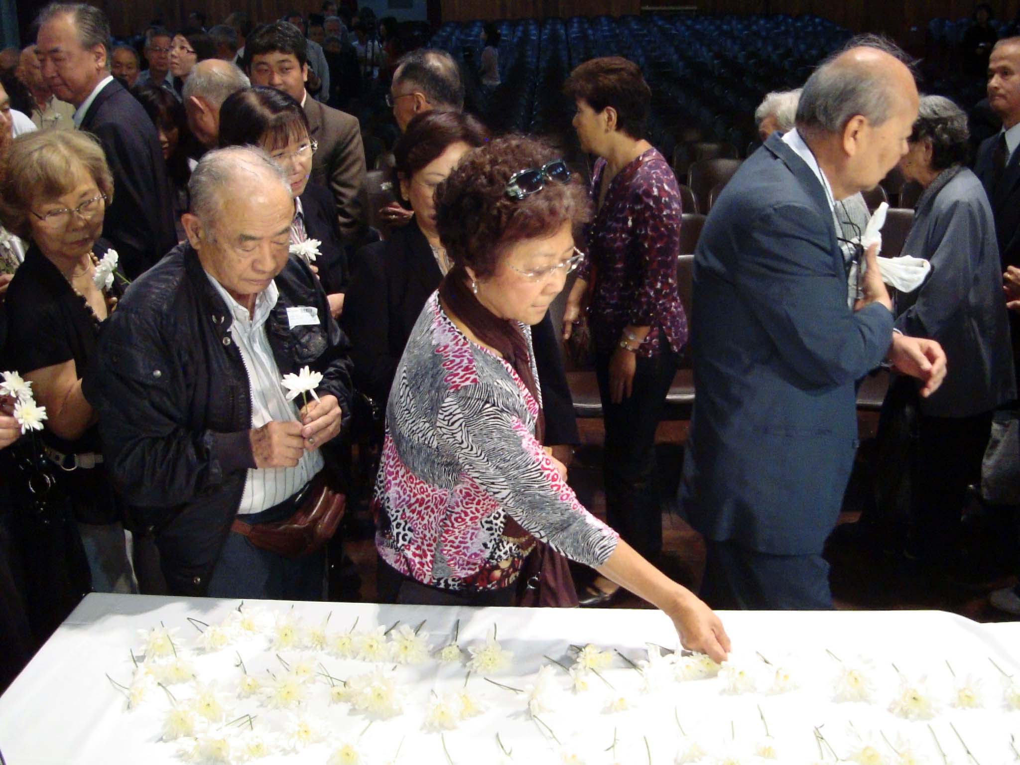 献花する参加者(写真提供 ブラジル日本文化福祉協会)