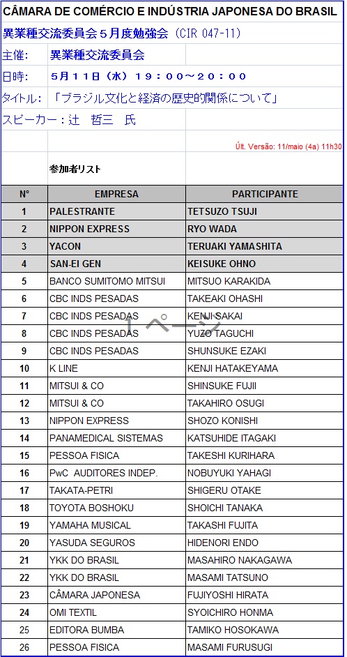 5月の異業種交流委員会が2011年5月11日ん午後7時から8時過ぎまで商工会議所大会議室に26人が参加して開催、講師には人文研の辻哲三監査役を迎えて、テーマ「ブラジル文化と経済の(歴史的な)関係について」講演した。