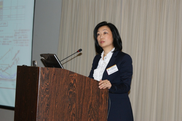 講演中の三菱東京UFJ銀行ロンドン支店欧州市場部の武田紀久子シニアカレンシーエコノミスト(fotos Rubens Ito/CCIBJ)
