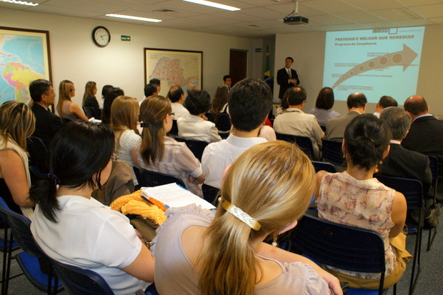 左からマルコス破入副委員長/講演者のVEIRANO ADVOGADOSのレオパルド・パゴット弁護士/FERREIRA RODRIGUES ADVOGADOS のウイリアム・ロドリゲス・パートナー/上野秀雄委員長/ワシントン・平瀬副委員長(Fotos: Rubens Ito/CCIJB)
