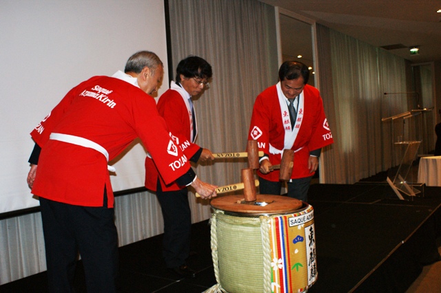 平田事務局長は鏡開き用の酒樽を提供した東山農産加工の岡橋亮輔社長他同社からの参加者に丁寧にお礼を述べた後で、鏡開きは三輪大使、小林首席領事並びに近藤会頭が行い、小林首席領事が震災からの希望の年、辰年で飛躍の年、日伯交流強化の年となるように乾杯の音頭をとった。