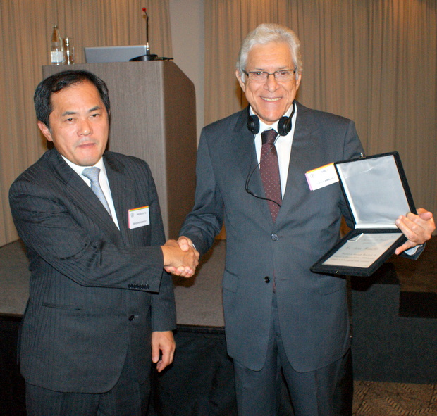 左から近藤正樹会頭/記念プレートを受取るイヴァン・ハマーリョ会長