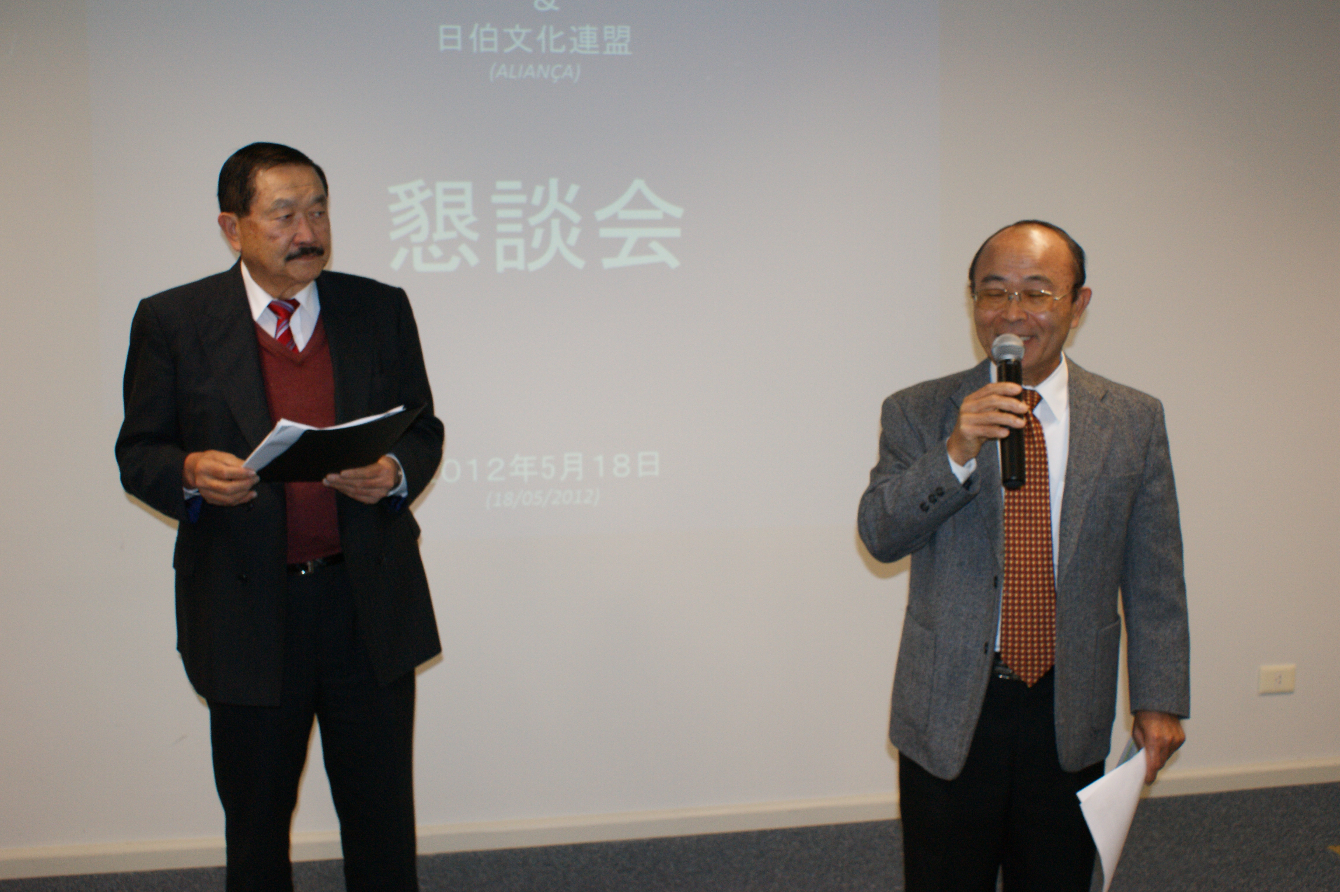 左からアンセルモ・中谷会長/開催挨拶を行う平田事務局長
