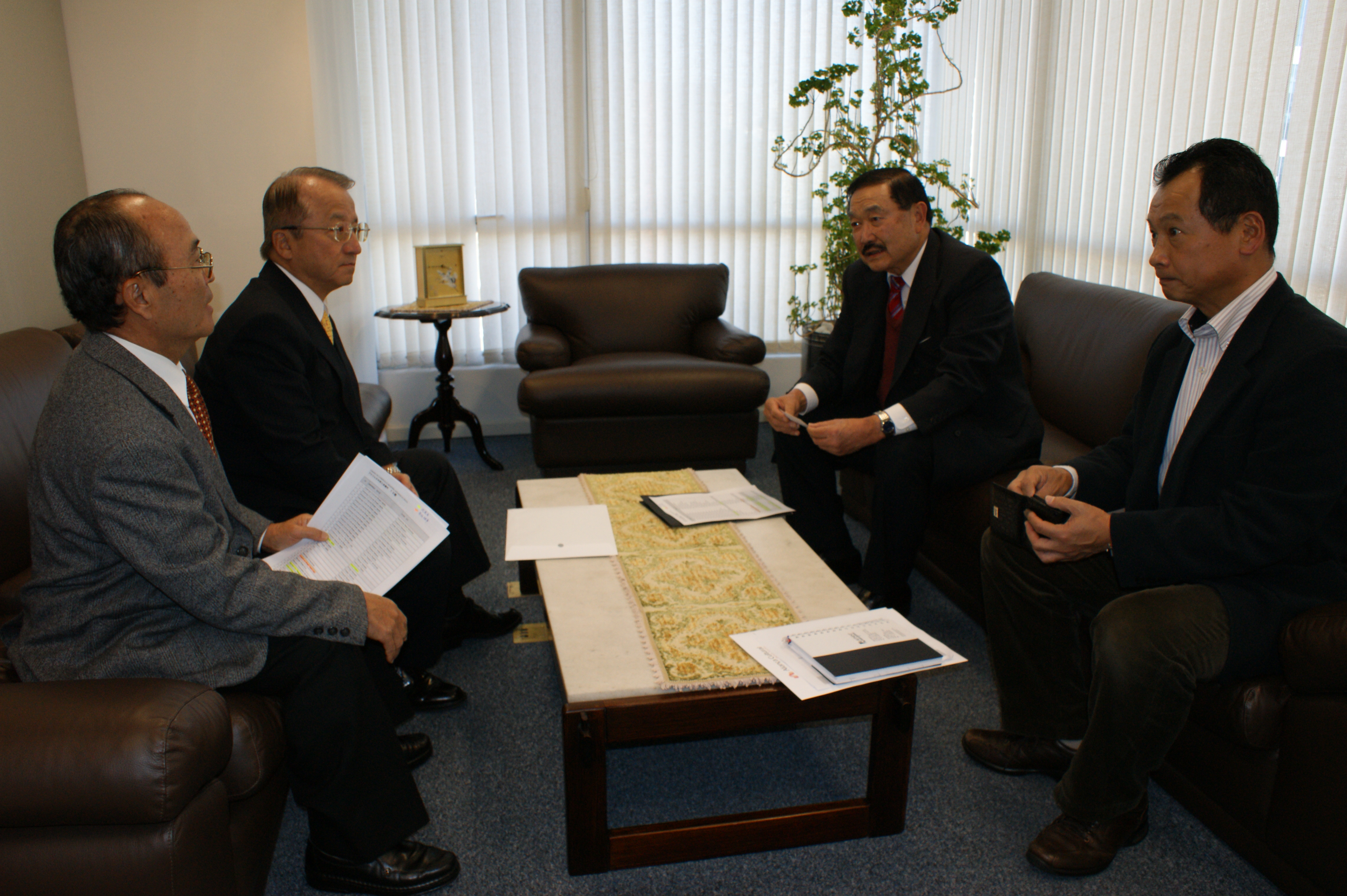 左からセミナーの打合せを行う平田事務局長/江上相互啓発委員長/日伯文化連盟(アリアンサ)のアンセルモ・中谷会長/上野企業経営委員長