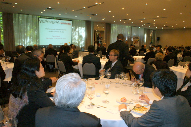 7月の懇親昼食会は、2012年7月13日正午から2時すぎまでチボリホテルに140人が参加して開催、タルソ・ジェンロ南大河州知事がテーマ「RS(Rio Grande do Sul)においての投資促進」について講演、司会は平田藤義事務局長が務めた。