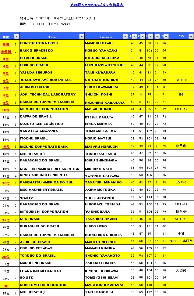 2012年10月28日(日)に第26回カマラゴルフ大会がサンパウロPLゴルフクラブで盛大に開催されました。今回は35名の参加を頂きました。