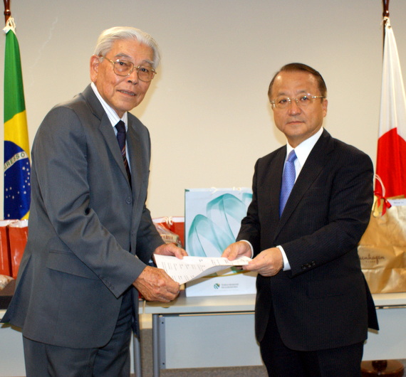 江上知剛相互啓発委員長から社会福祉法人救済会「憩の園」吉岡黎明会長へ同園入園者へのクリスマス景品の寄付を贈呈(Foto: Rubens Ito / CCIJB)
