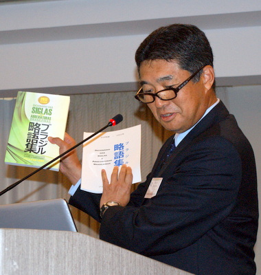 ブラジル略語集の出版案内を行う中西俊一 渉外広報委員長