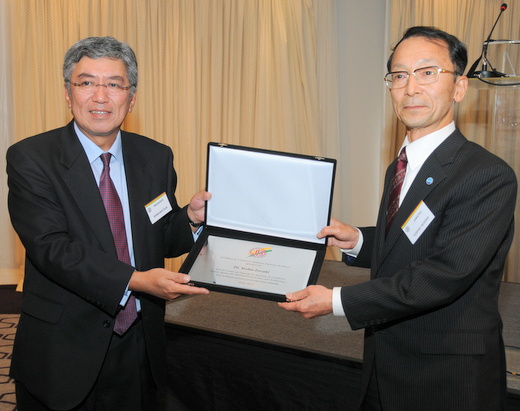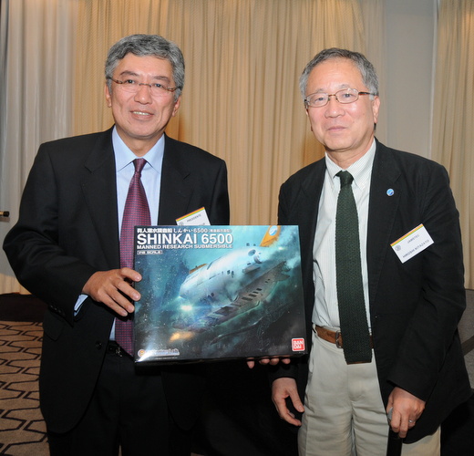 磯﨑 芳男JAMSTEC海洋工学センター長は「JAMSTECにおける海洋技術開発と研究船・探査機の運用」と題して、JAMSTECの特徴、技術部門の目標、7隻ある調査・研究船、建造庁の研究船、平成24年度運航軌跡、研究船の運用、地球深部探査船「ちきゅう」の建造、石油・天然ガス・金属物質、メタンハイトレードの海洋試験、有人潜水調査船「しんかい6500」の探索時間、海中無人探査機の開発、4次元総合海洋調査・観測システムの構築などについて説明、藤井会頭から北里 洋JAMSTEC海洋・極限環境生物圏領域長並びに磯﨑 芳男JAMSTEC海洋工学センター長へ記念プレートが贈呈され、北里 洋JAMSTEC海洋・極限環境生物圏領域長から藤井会頭に「しんかい6500」のプラモデルが贈呈された。