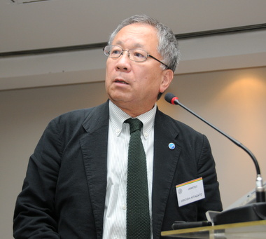 特別講演を前に藤井晋介会頭は歓迎の辞を述べ、北里 洋JAMSTEC海洋・極限環境生物圏領域長は、「JAMSTECと深海研究 -「よこすか/しんかい6500」世界一周航海に関連して-」と題して、リオ沖の大西洋海底で陸地でのみ組成される花こう岩が大量に発見されたが、伝説のアトランティス大陸とは関係がないと前置きして、JAMSTECの1971年の設立の経緯、経団連との結びつき、JAMSTECの役割、組織・人員構成、主な研究分野、主な開発分野、JAMSTEC所有の船舶一覧、友人・無人探索機一覧、深海ドリリング計画、地震・津波監視システム、新規海洋資源の開拓、賛助会制度、企業との共同開発事例、しんかい6500による世界1周航海、