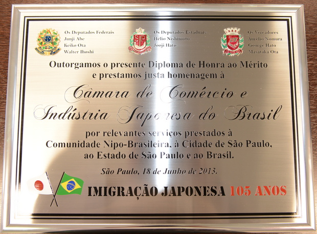 2013年6月17日、サンパウロ州議会にて行われた日系連邦議員、サンパウロ州議員、サンパウロ市議員の主催によるブラジル日本移民105周年記念式典へ会議所から平田藤義事務局長が出席した。式典のなかで、主催者から会議所を含む日系主要5団体へ記念プレートが贈呈された。
