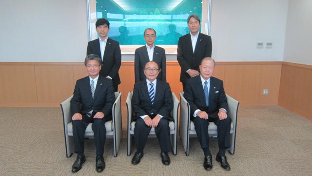磐田信用金庫訪問にて記念撮影。高木昭三会長(右下)、髙栁裕久理事長(左下)、平田事務局長(中央)