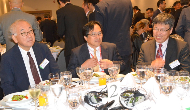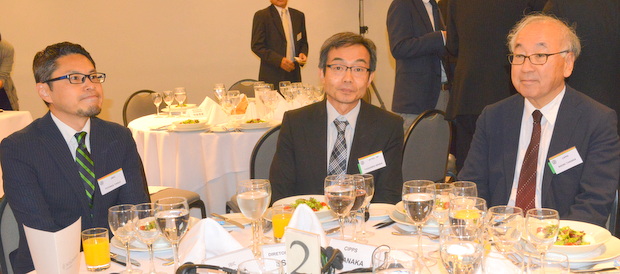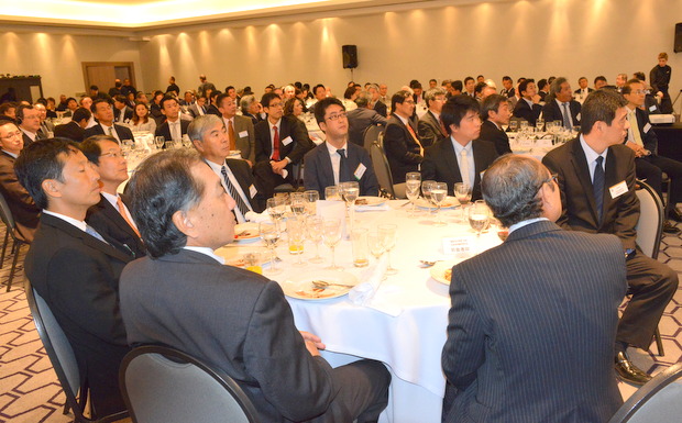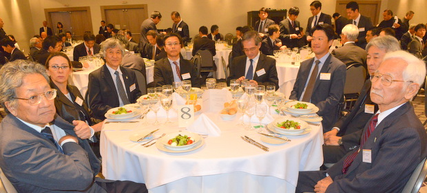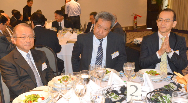 懇親昼食会は2014年11月14日正午から午後2時までインターコンチネンタルホテルに160人が参加して開催、司会は平田藤義事務局長が務め、初めに特別ゲストとして田中  直毅 CIPPS(国際公共政策研究センター)理事長、金永 芳典 CIPPS(国際公共政策研究センター)主任研究員、牧野 暢彦CIPPS(国際公共政策研究センター)マネージャー、佐野 浩明 在サンパウロ日本国首席領事、室澤 智史 JICAブラジル事務所 所長、安井 豊 JBIC国際協力銀行 代表、木多 喜八郎 ブラジル日本文化福祉協会 会長、本橋 幹久 県連 会長、後藤 隆 ブラジル日本商工会議所第8代会頭、貞方 賢彦 ブラジル日本商工会議所第13代会頭、田中 信 ブラジル日本商工会議所第15代会頭、頃末 龍彦 アンドレ こどものその 理事長、河野 浩之 在アルゼンチン日本商工会議所会頭 (亜国三菱商事会社社長)、二宮 正人 CIATE理事長、アルバロ・キン 韓国商工会議所 副会頭が紹介された。