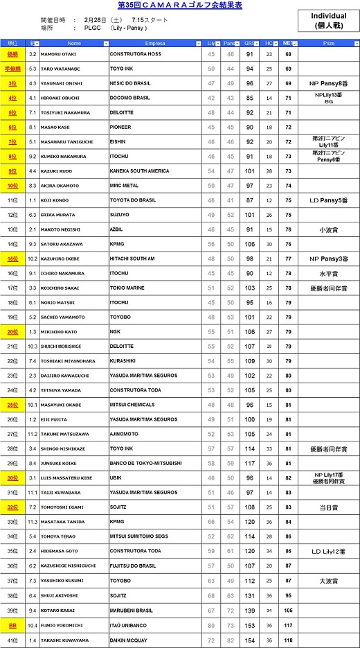 2015年2月28日(土)、第35回カマラゴルフ大会がサンパウロPLゴルフクラブで盛大に開催されました。今回は43名の皆様のご参加を頂き、表彰式も大盛況の内に終了いたしました。