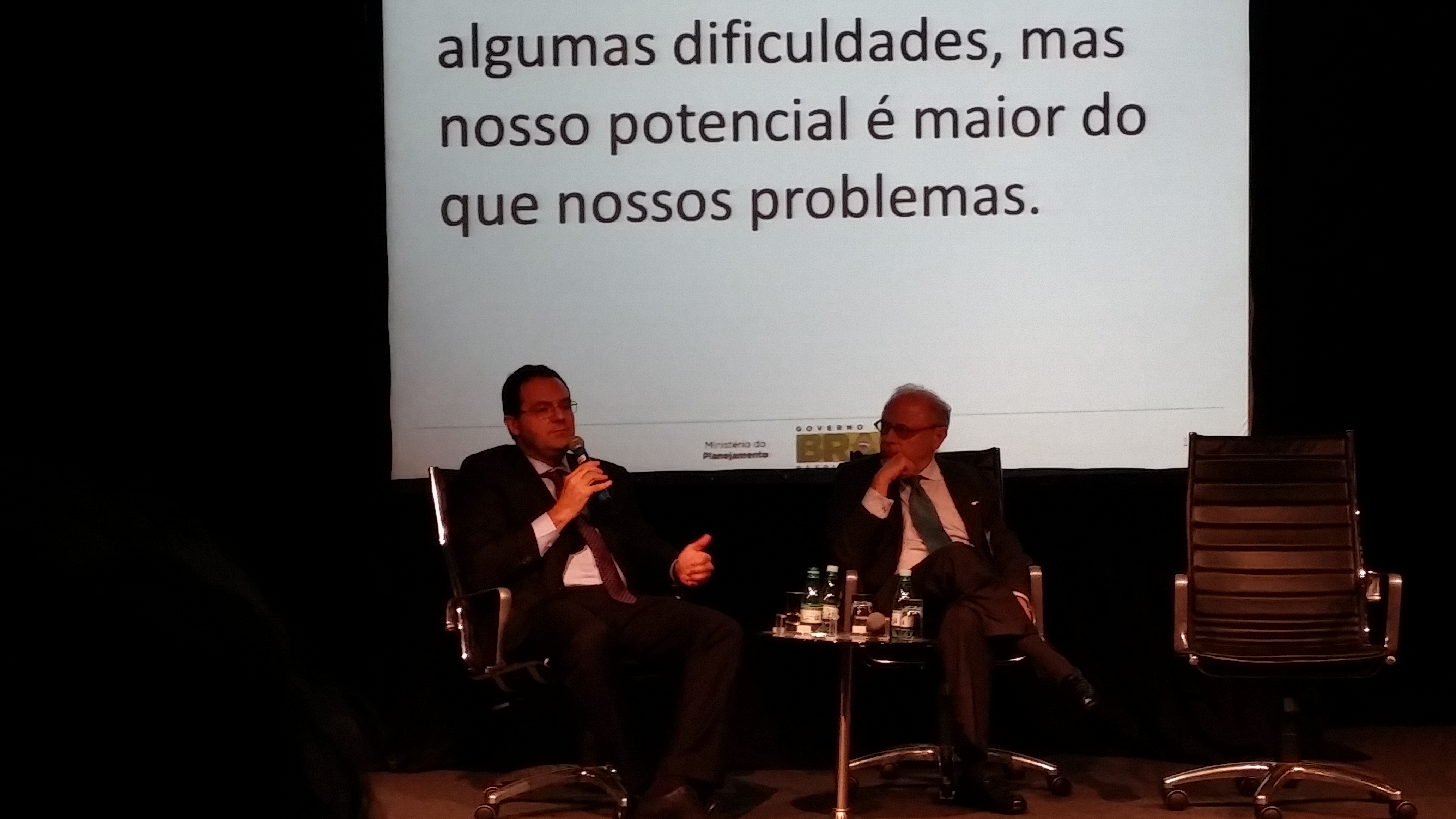 ブラデスコのチーフエコノミスト(同フランス会議所副会頭)のオタービオ氏がモデレイターを勤め、財界人や在ブラジルEurocâmaras代表者また新 聞記者等を交え活発な質疑応答が行われた。行政府を小さく20省位に減らしたら予算削減に繋がらないかと言う興味深い質問に対し、かつて独立して増えた省は 小さな諸局・庁から構成、これを再び関係省庁に統合しても削減効果は小さいと述べた。2011年頃には1.6レアル/ドルのレアル高下では、保護主義的な政策を取らざるを得 なかったが、今は全く状況が違い3レアル/ドルのレアル安下ではその必要性はない。為替の介入をせず輸出入共に増えるのが望ましく、伝統的なヨーロッパ諸 国をはじめ先進諸国との通商拡大に期待している。豊富な外貨準備高はコストは掛るが経済政策運営にとって自由度があり自国の「問題解決は我々自身如何に 掛っている」と強調、「現在、幾つかの困難に直面しているが、潜在成長力は抱えている問題よりも大きい」と結んだ。