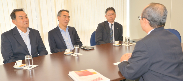 運輸サービス部会の森田 透 部会長(山九ブラジル)並びに細谷 浩司副部会長(ブラジル日通)、川手 純一副部会長(日本郵船ブラジル)が2015年3月20日に商工会議所を訪問、応対した平田藤義事務局長に森田 透 部会長のミナス州への転勤に伴って、細谷 浩司副部会長が部会長を就任することを報告した。