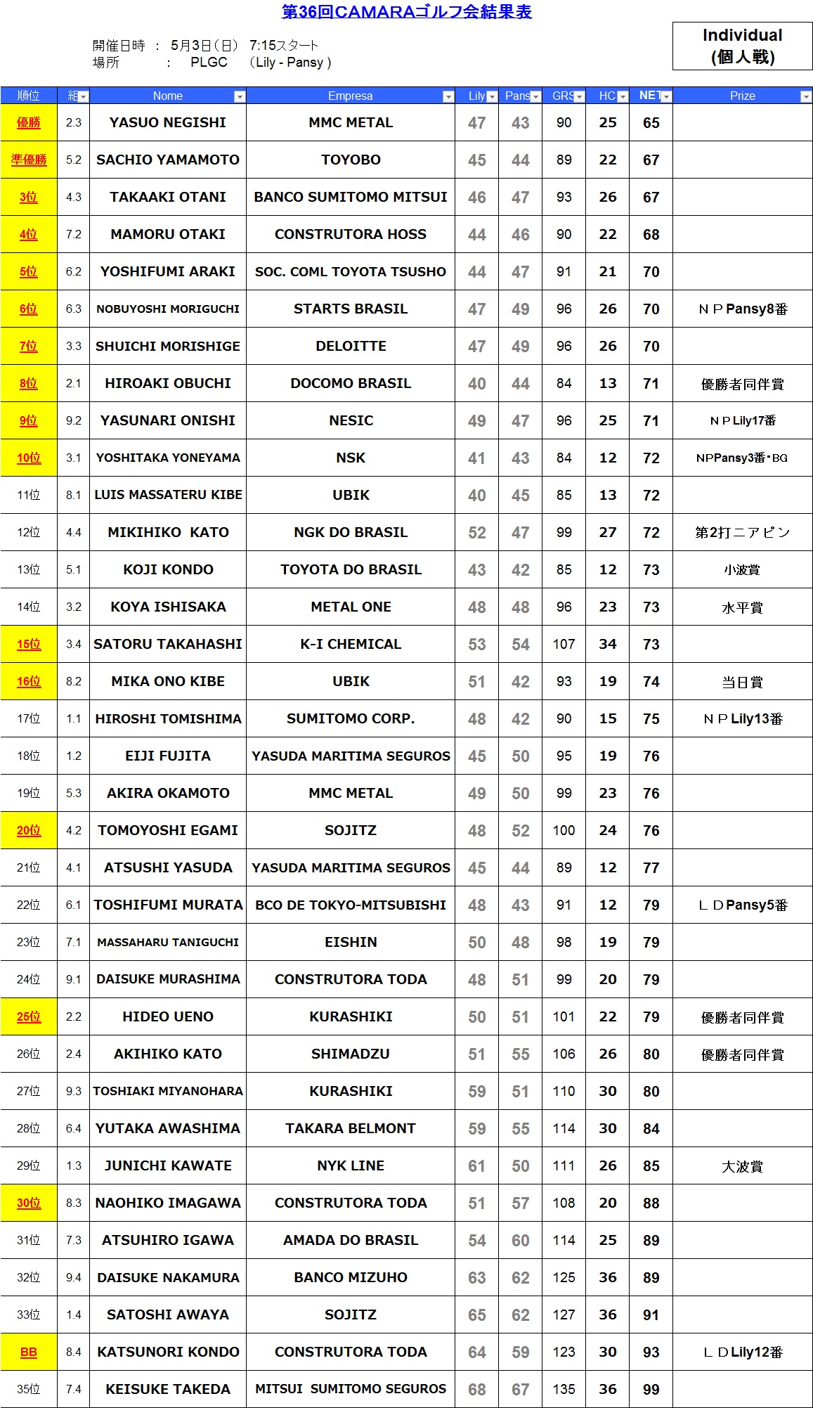 優勝は根岸様(MMC METAL社)がLILY47・PANSY43、HC25、NET65のスコアで獲得、2位には山本様(TOYOBO社)、3位には大谷様(BANCO SUMITOMO MITSUI社)が入りました。