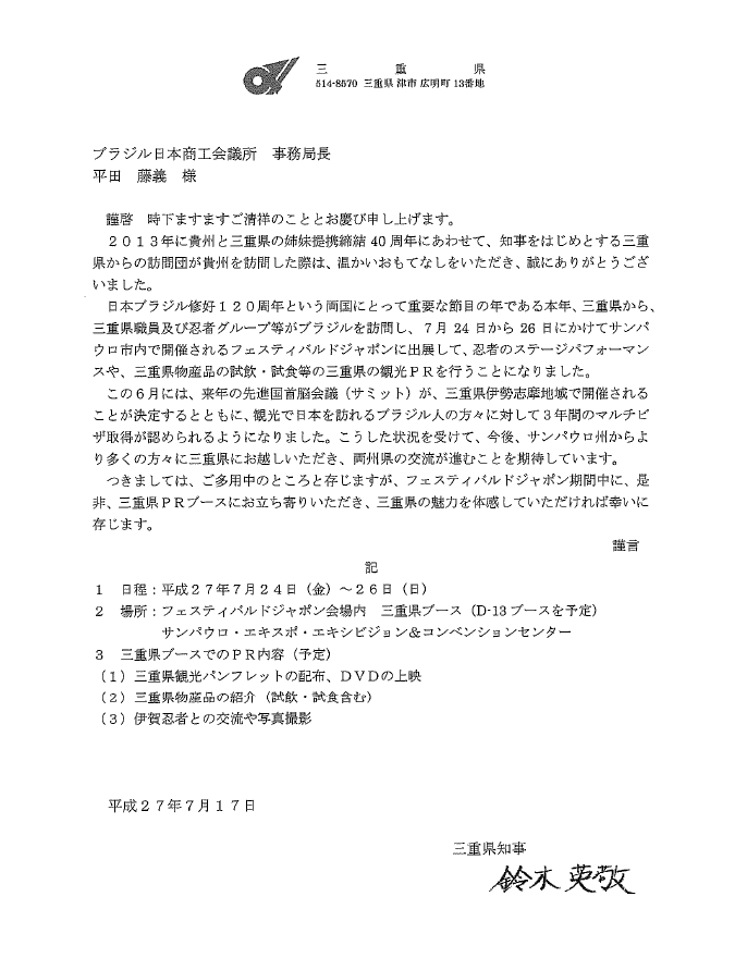 三重県国際戦略課並びに多文化共生課、ブラジル三重県人会文化援護協会一行が2015年7月23日午前にブラジル日本商工会議所を訪問、初めに三重県国際戦略課の大平和輝課長補佐は、応対した平田藤義事務局長に同氏が昨年9月に三重県庁に鈴木英敬知事を訪ねて、同知事の尽力によるマルチビザ要件緩和措置の早期実現に対してお礼を述べたが、鈴木英敬知事依頼の返礼の報告並びに7月24日から26日にサンパウロ市内で開催されるフェスティバルジャポンでの伊賀忍者ステージパーフォーマンス並びに三重県物産展(日本酒、ひやむぎ、かつお節、かつお節削り器、お酢、萬古焼、真珠など)での試飲・試食などの三重県の観光PRついて説明した。