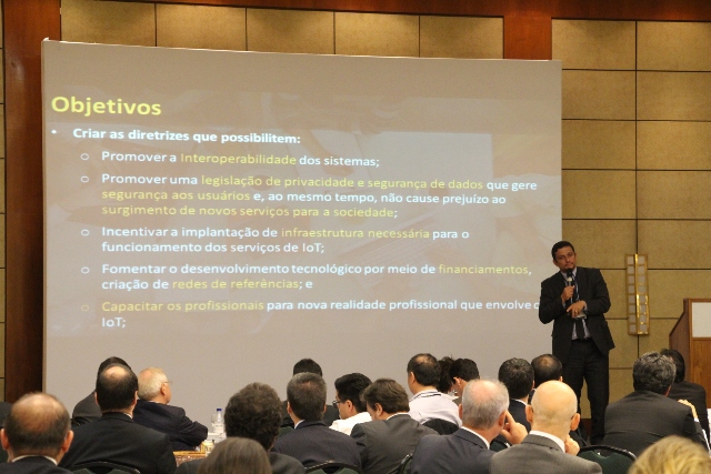 連邦政府が今後のIoTプランを説明すると言う事で日系(多くの進出企業)および多国籍のテック企業約100名が参加、MCTICのジョゼ グスターボ情報政策局科学技術産業部長がブラジルのIoT政策について講演を行った。