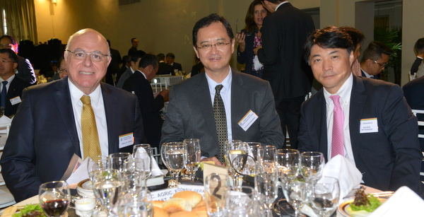 左からサンパウロ州のアルナルド・ジャルジン州農務配給局長/中前隆博 在サンパウロ日本国総領事/松永愛一郎会頭