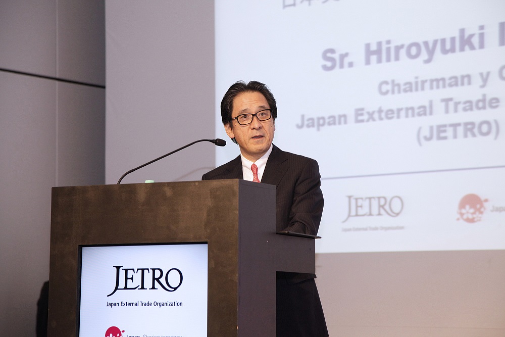 最初、主催者を代表しJETROの石毛博行理事長が、昨年のマクリ政権誕生から丁度1年が経過、日本企業のアルゼンチンに対する関心が非常に高まっている。これを受けて今年7月、中南米地域では最大規模のインフラミッションを亜国に派遣。さらに亜国におけるJETROの機能を強化するため事務所を再開することにした。ブラジル駐在中にウルグアイも担当、中南米地域のエキスパートでスペイン語も堪能な紀井寿雄(としお)所長がその任務にあたるので皆様に紹介したいと開会挨拶。