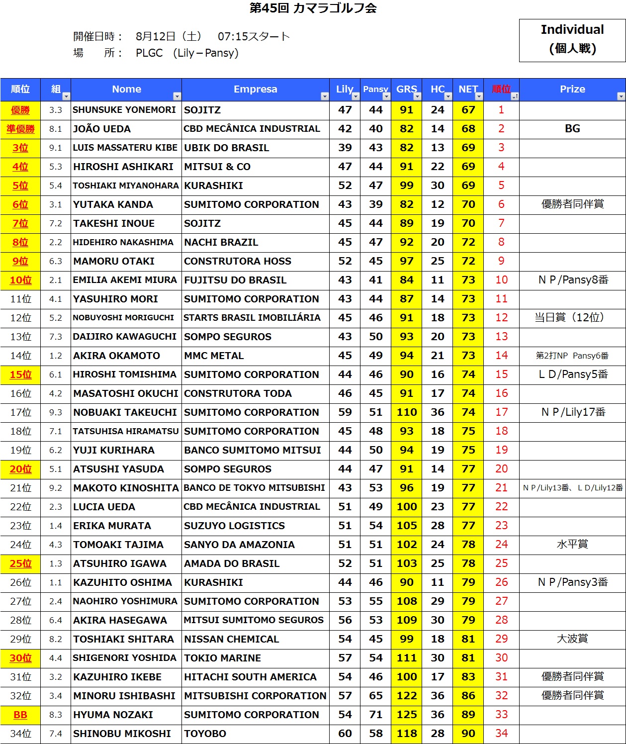 優勝はYONEMORI様(Sojitz)がLily 47・Pansy 44、HC 24、NET 67のスコアで獲得、2位にはUEDA様(CBD Mecânica Industrial)、3位にはKIBE様(Ubik)が入りました。