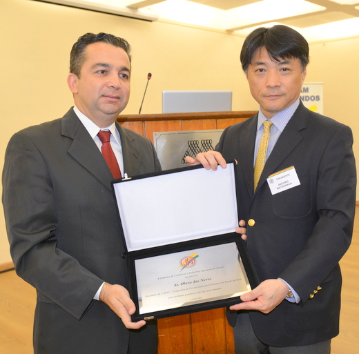 カラジャス鉄道は、約900キロメートルで鉄鉱石や銑鉄を輸送、北部随一の空港網、パラー州への進出企業向けには、州政府は商品流通サービス税(ICMS)、 連邦政府は法人所得税(IRPJ)の税制恩典、新しい投資に対するSelo de Prioridade恩典。州内生産の鉱物では生産並びに埋蔵量トップのアルミ。生産トップの銅や石灰、マンガン。カラジャス鉱山を擁する鉄鉱石の生産並びに埋蔵量とも2位。また熱帯フルーツではアサイやクプアス、カカオ、デンデ―油はそれぞれ1位、パイナップルは3位、バナナは5位。パラー州内の穀物生産は300万トン、耕地面積は30万ヘクタール、マット・グロッソ州の大豆2,000万トンを州内の港湾から輸出。州内の耕作地価格は安価で干ばつや霜害がなくて日照時間が長い。土地が肥沃で肥料コストが最小限で、水上輸送や道路輸送の北部回廊、貿易には地理的に有利で農畜産、漁業、鉱業、輸出基地など企業進出や投資に好条件の整ったパラー州への投資を促して講演を終え、松永会頭から記念プレートが贈呈された。