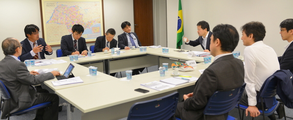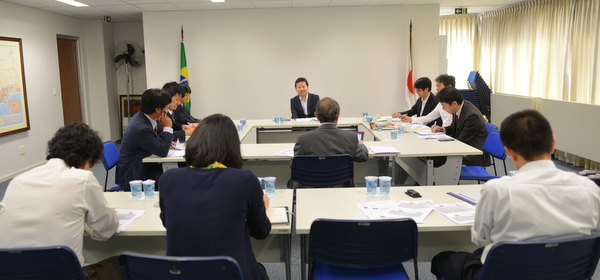 参加者は松永愛一郎会頭(伯国三菱商事)、企画戦略委員長の大久保敦 副会頭(JETROサンパウロ)、政策対話委員長の粟屋聡 専任理事(双日ブラジル会社)、芦刈宏司 政策対話副委員長(ブラジル三井物産)、二宮康史 政策対話副委員長(JETROサンパウロ)、櫻井淳 政策対話副委員長(ブラジル三菱商事)、佐久間太郎 政策対話副委員長(ブラジル双日)、岩瀬恵一氏(JETROサンパウロ)、商工会議所から平田藤義事務局長、吉田章則調査員、近藤千里アシスタント、大角総丙編集担当