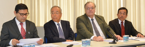 左からペドロ・マンクエーリョ商工副大臣/駐パラグアイ日本国大使館の石田直裕 特命全権大使/在サンパウロパラグアイ総領事館のエンリケ・インスフラン総領事/ジェトロ中小企業海外展開現地支援プラットフォームの石田ミゲル コーディネーター