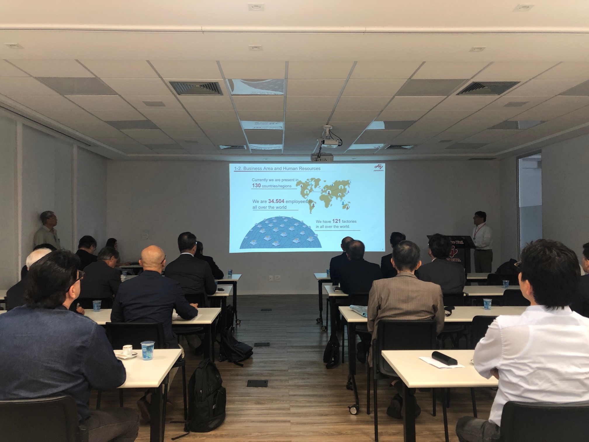 早朝サンパウロを出発したグループは午前10時過ぎにリメイラの工場に到着、まずは近藤一也副社長及びカルロス・タカタ事業所長によるセミナールームでのプレゼンテーションが行われた。味の素の沿革や現在の規模の他、資源循環型(バイオサイクル)生産を通じ生産工程で出た残さを廃棄せず、副成物として飼料や有機肥料にするなど資源を効率的に利用、ゼロエミッション計画、エネルギー消費削減、空調においてはオゾン層破壊を防止するためのフロン代替など環境保全に対する活動などについて説明が行われた。