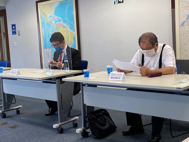 理事選挙の開票にあたって2021/2022年理事選挙管理委員会の二宮正人委員長、フェルナンド・ミハラ委員、2021/2022年度監事選挙管理委員会の讃井慎一委員長、安田篤委員、長島 公一委員、事務局から平田藤義事務局長並びに日下野成次総務担当が参加。