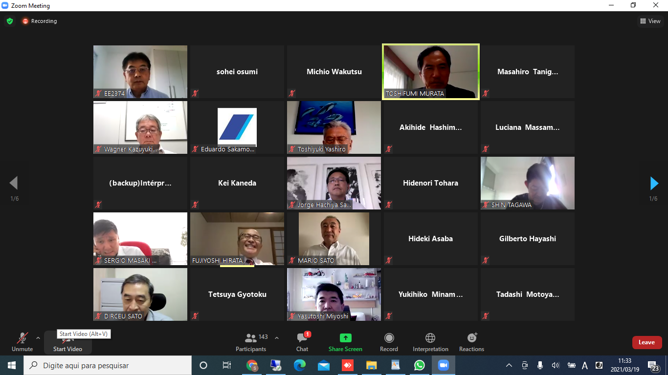 初めに村田俊典会頭が開催挨拶で、新型コロナウィルス感染拡大防止のため、引続きオンラインのZoomを利用しての開催を説明、2020年度事業報告として、会議所の活動では、米中の貿易摩擦、3月11日のパンデミック宣言、3月以降の昼食会中止、会員へのHPによる告知活動および緊急アンケート実施、4月以降基本的にリモートワーク、JETRO報告会に参加・情報共有、年2回開催の業種別部会長シンポジウムは「webフォーラム」名称を変更、8月から12月まで計6回開催。在サンパウロ桑名総領事とネットワーキングなどについて説明。昨年はCOVID-19の影響で会員企業38社が退会。2021年の会議所活動は基本方針に変更はないが、更なる情報提供、ネットワーキングの活性化、更なる日伯両政府との連携強化。4月から新体制を軸に、タイムリーな情報提供、地場企業のメリット向上を図ると説明した。