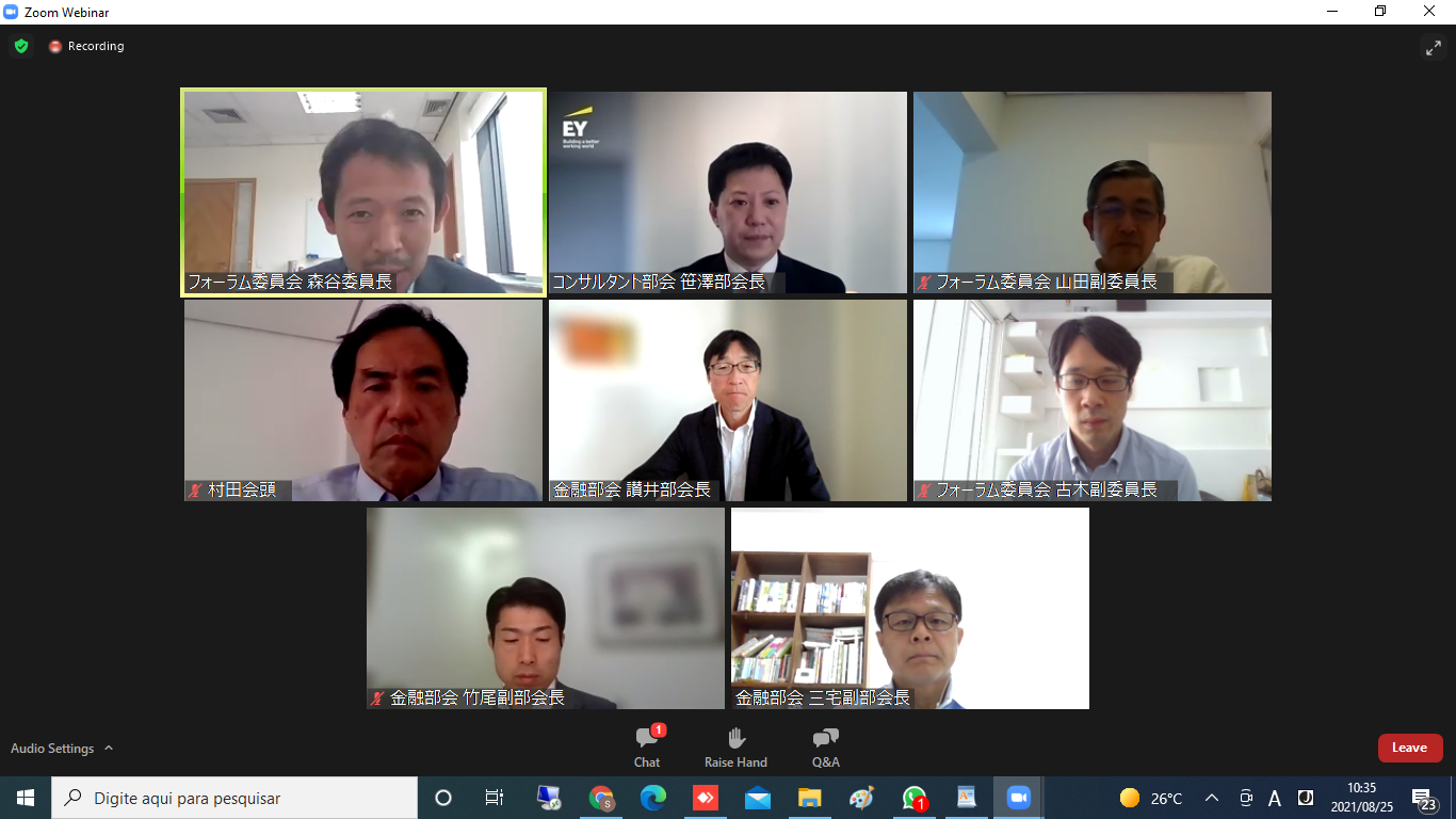 金融部会並びにコンサルタント部会合同の第一回フォーラムは、2021年8月25日午前9時30分から10時30分まで100人以上が参加して開催、進行役は森谷伸晃フォーラム委員長が務め、初めに村田俊典会頭が開催挨拶で、オンラインフォーラム開催は、ブラジルでのビジネスを行う上で多くの情報を入手する必要性に対応するために、各部会の貴重な情報を会員企業が共有して、企業経営に生かす目的を説明した。