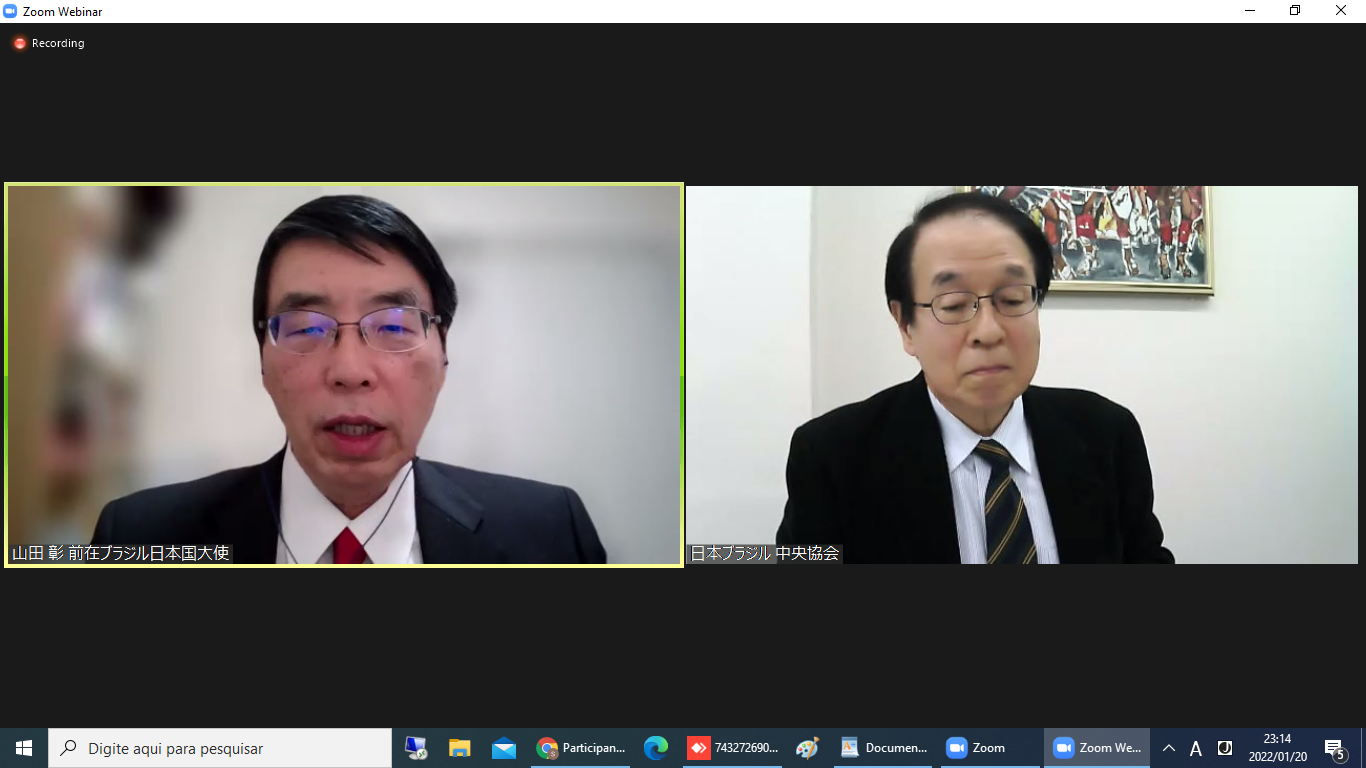 日本ブラジル中央協会並びにラテンアメリカ協会共催のオンライン講演会は、2022年1月20日午後10時から深夜まで280人が参加して開催、ゲストに山田彰 前在ブラジル日本国大使を迎え、テーマ「4年3か月の駐ブラジル大使を終えて」について講演した。進行役は日本ブラジル中央協会専務理事の宮田次郎事務局長が務めた。
