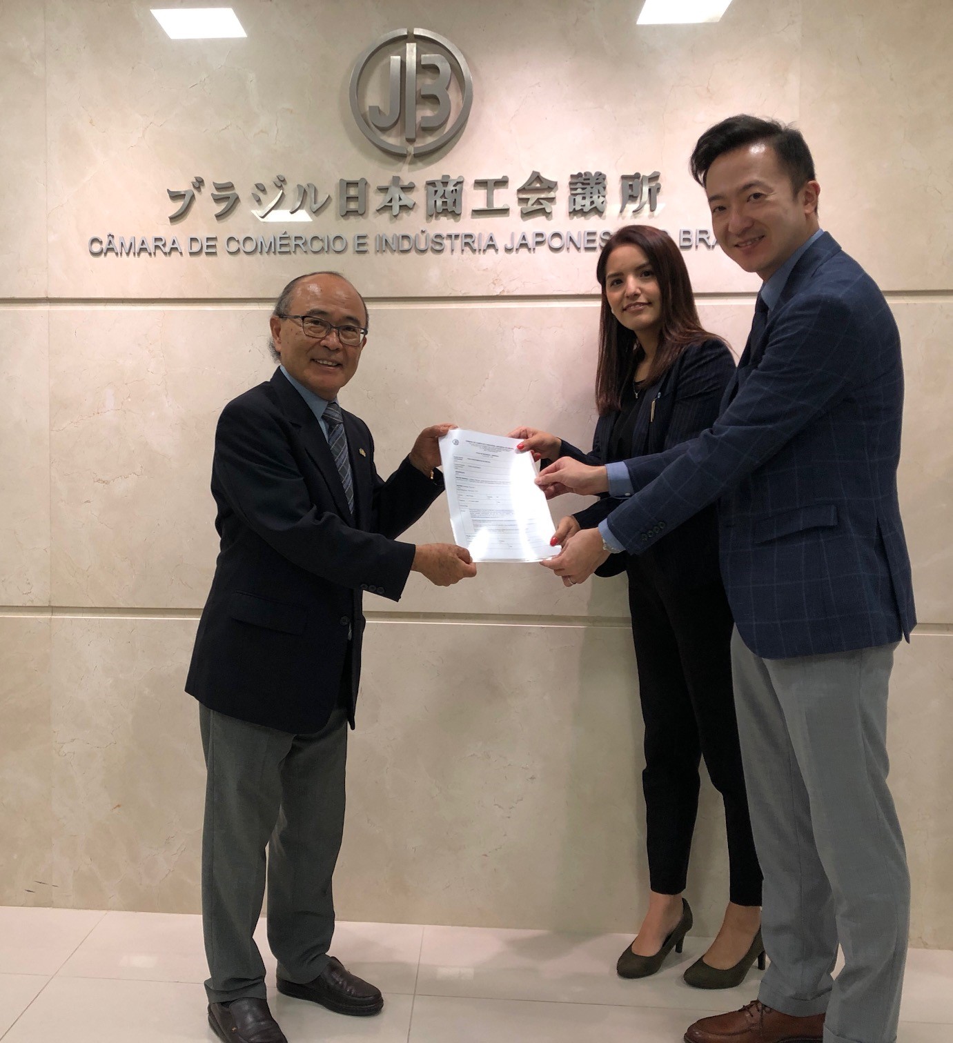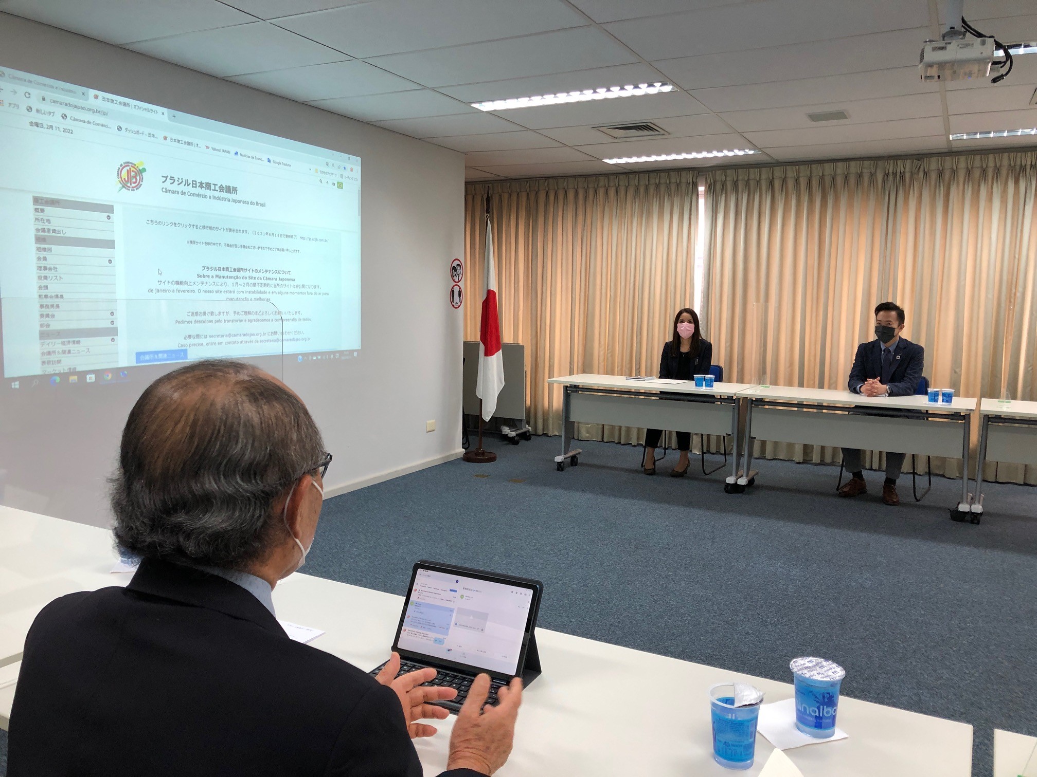 戸田インベストメント ブラジル社の酒井勲社長と片山サラ営業担当主任が2022年2月11日に商工会議所を訪問、応対した平田藤義事務局長に入会申込書を手渡した。