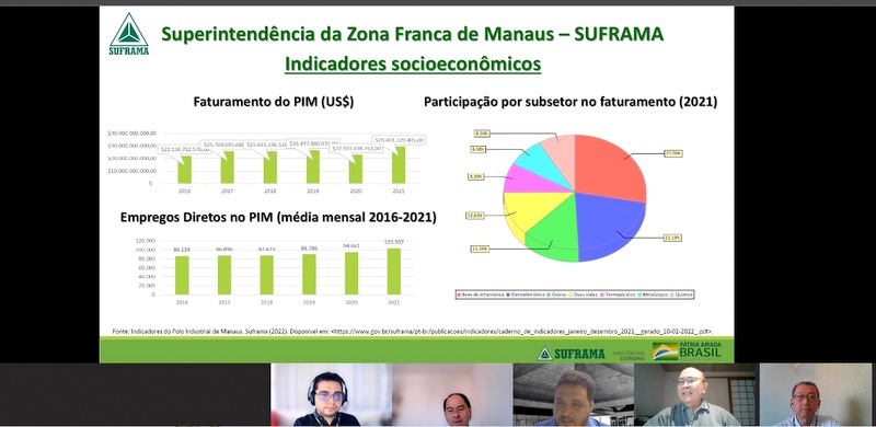 2022年5月26日、マナウス・フリーゾーン監督庁(SUFRAMA)の ルイス・フレデリコ・オリヴェイラ・デ・アギアル(Luiz Frederico Oliveira de Aguiar)貿易部総括代理と平田藤義会議所事務局長との面談がオンラインで行われた。
