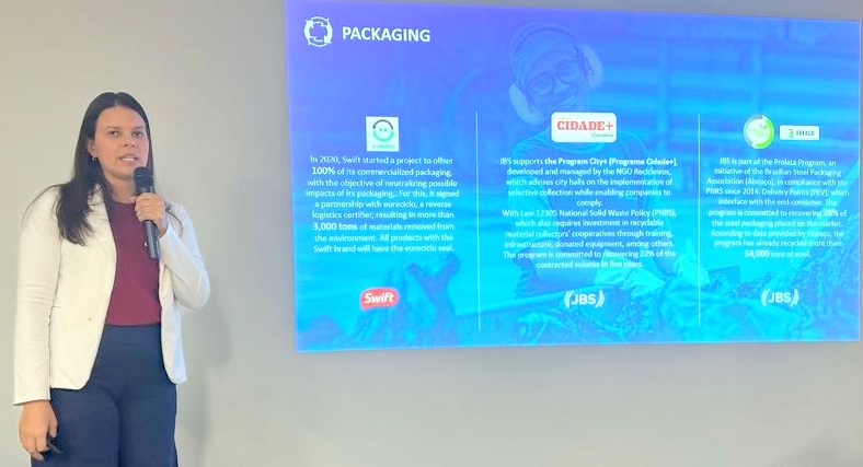 講師にはJBS社サステナビリティ担当のMrs. Maria Paula Silveira Bibar課長を招き、初めにJBSの社歴や事業内容を紹介、ブラジルは世界4位の二酸化炭素排出国、農畜産関連の二酸化炭素排出、Green Officeの機能や役割、牛肉生産チェーン体制、透明性畜産体制のプラットフォームのロードマップ、畜産によるメタンガス発生の抑制を含めた同社の環境に関する取組み。JBSのサステナビリティ戦略、JBS社内におけるサステナビリティの課題に対する挑戦と機会、JBSの脱メタンガス対応のNetzero2040プランなどについて説明した。