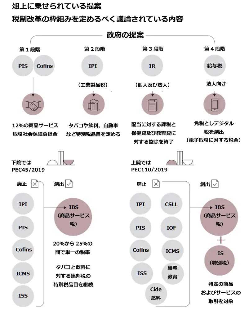 上下両院の国会議員で構成する合同委員会が、税制改革に関する2件の憲法改正案(PEC)の検討に着手している。この2件のPECはいくつかの差異が存在するものの、ICMSだけでなくISSを商品サービス税(IBS)に統合するという点では共通している。