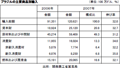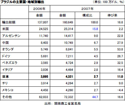 ブラジルからの主要輸出品目は鉄鉱石、大豆や鶏肉など思いがちだが、航空機47億ドル、乗用車も47億ドル、自動車部品32億ドル等に代表される工業製品が半分以上を占め粗糖、セルロースや鉄鋼半製品などを加えると約7割となる。 一次産品の割合は3割に過ぎない。一方、輸入は原材料/中間財が約半分を占め、資本財が2割、以下燃料/潤滑油、消費財の順となっている。 07年は06年同様、輸入の伸びが輸出の伸びを顕著に上回った結果、貿易黒字が11年振りに前年を下回った。一次産品の輸出は成長しているが、レアル高の影響で輸出全体のペースが低下傾向にある。
