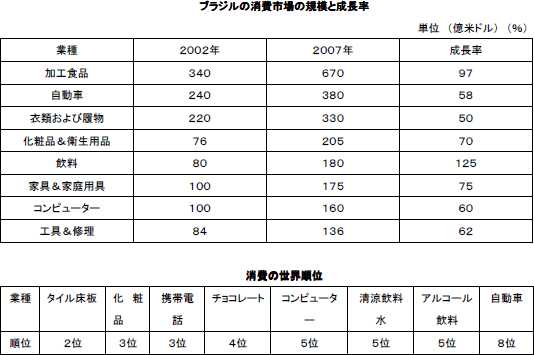 代表的な業種別の過去5年間における消費市場の規模と成長率および消費の世界順位を下表に示す。