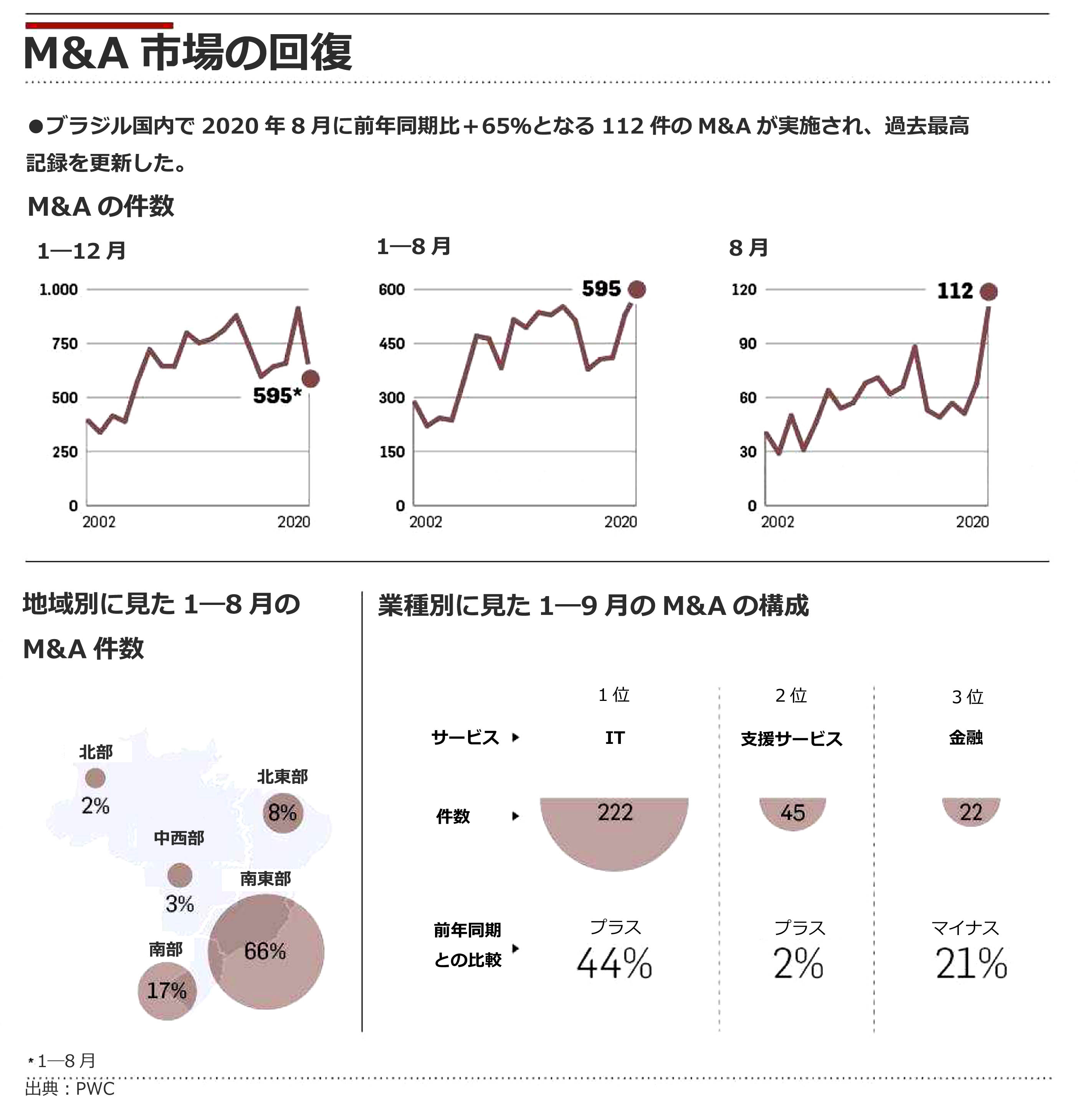 PwCブラジルのレポートによるとブラジル国内で2020年8月に112件の合併と買収(M&A)が実施された。これらは不況と事業の継続を主な理由にしており、成長戦略に基づくものではなかった。